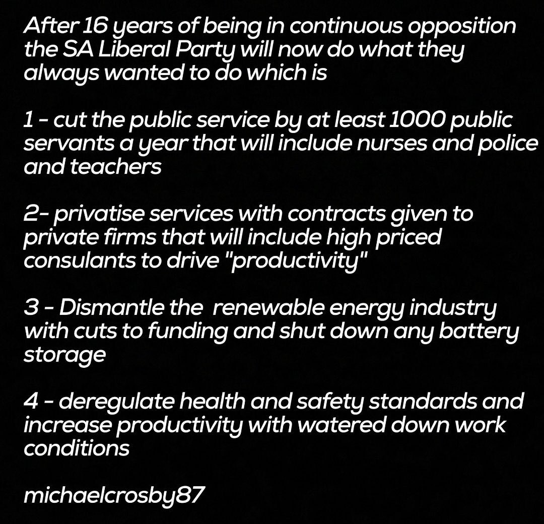 Premier with a plan all right. Here is just some of what's in store for South Australia under a Liberal Govt during the next four years. Liberals govern for the wealthy elite not for you. Always have, always will.