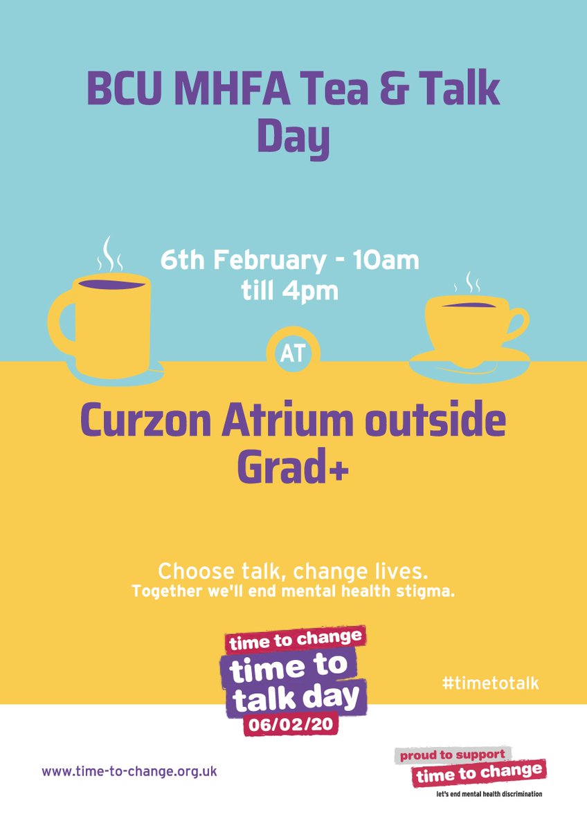 @Bcumhfa will be holding a#TimeToTalkDay this Thursday, between 10am-4pm in the Curzon atrium. Lets get talking!