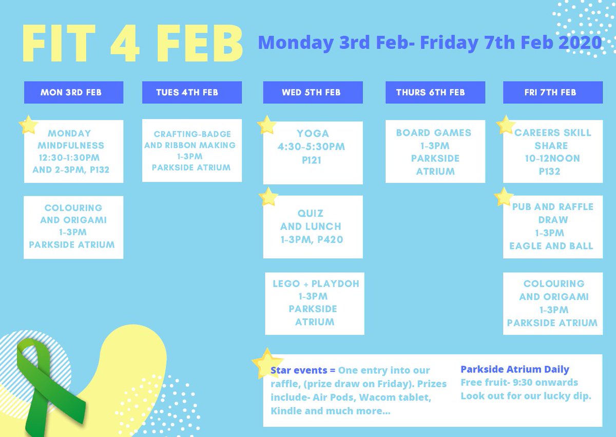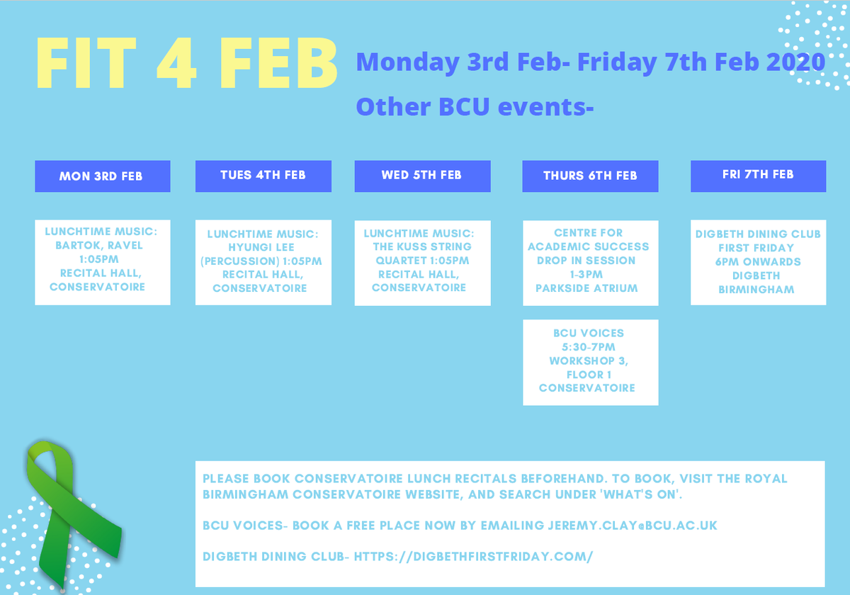 #FIT4FEB week within the ADM campus! Here are just a few of the different events taking place across@MyBCU campus... all designed to help YOU feel good!#BCUGraduatePluspic.twitter.com/6lEmPdKpl5