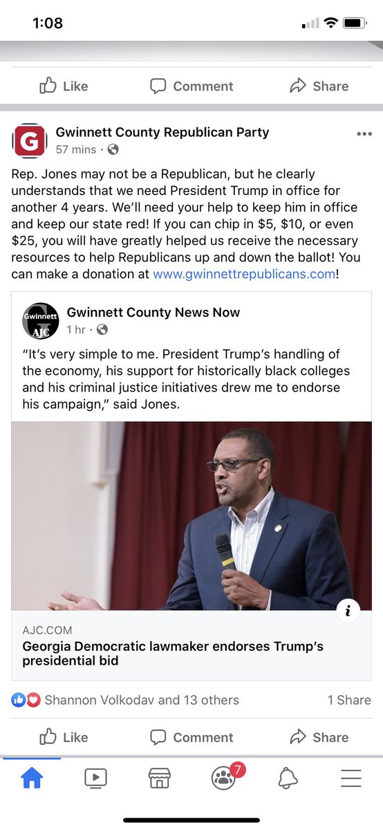 In a conference call with the @ajc, House Dem leaders endorsed Jones’ primary challenger, Rhonda Taylor. House Minority Leader @TrammellBob said he was writing her a check today. #gapolhttps://www.ajc.com/blog/politics/georgia-democratic-lawmaker-endorses-trump-presidential-bid/dpqTbn2pBPIivHNgPdNSdN/ …