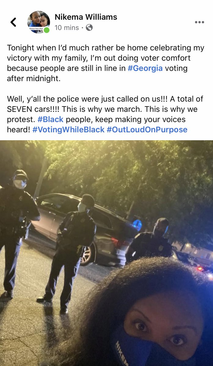 @NikemaWilliams, chair of the@GeorgiaDemocrat Party, was among a group of organizers cheering voters still in line at a Union City precinct early Wednesday when someone called the police and several patrol cars showed up.#gapolpic.twitter.com/BmOwiPWKby