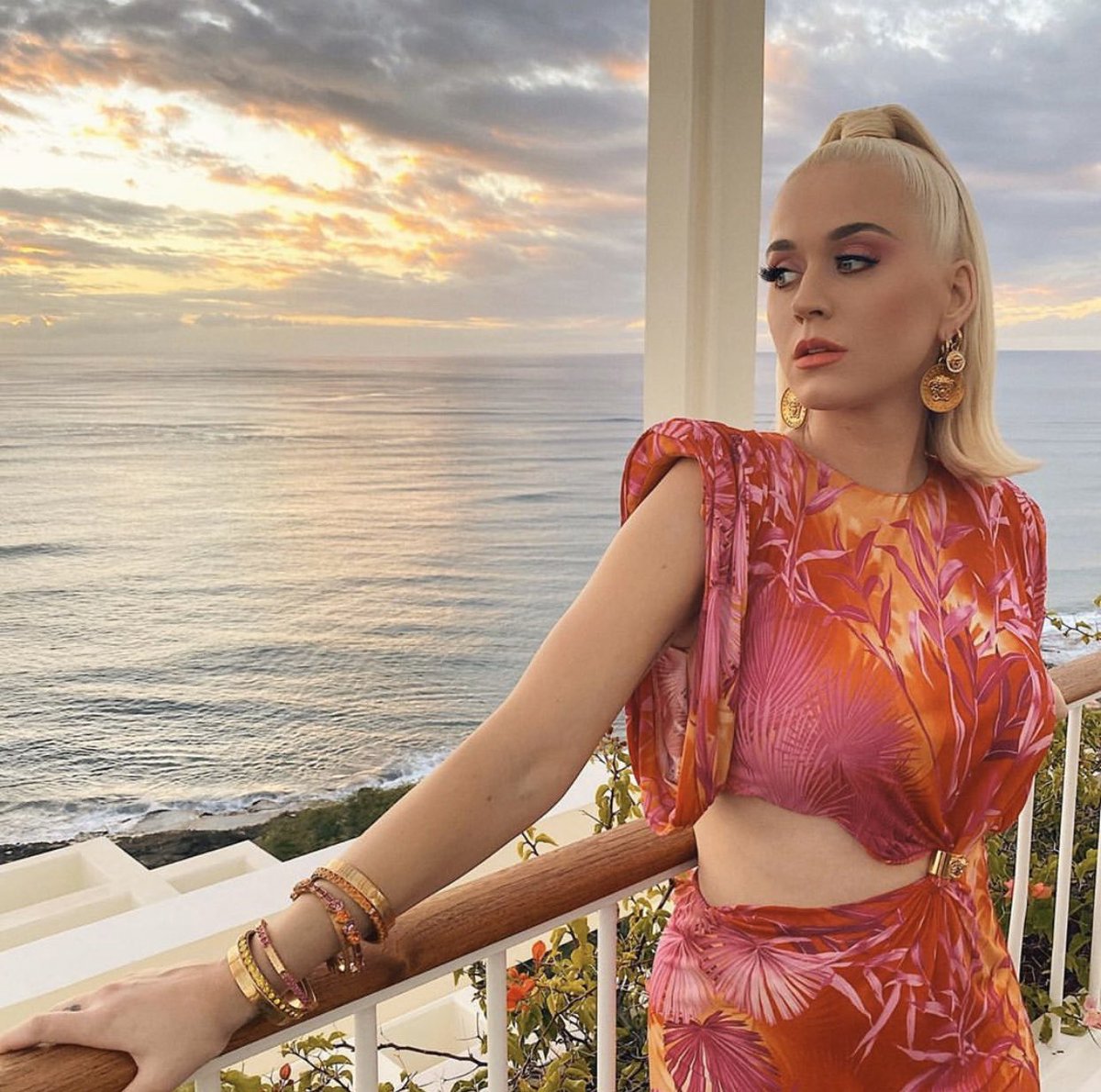 #KatyPerry wears a Jungle print dress from the#VersaceSS20 Collection with sculptural sleeves and midriff cut-outs. She completes her look with Medusa earrings and Safety Pin-embellished sling back sandals.#VersaceCelebritiespic.twitter.com/OU0KbL9QJ0