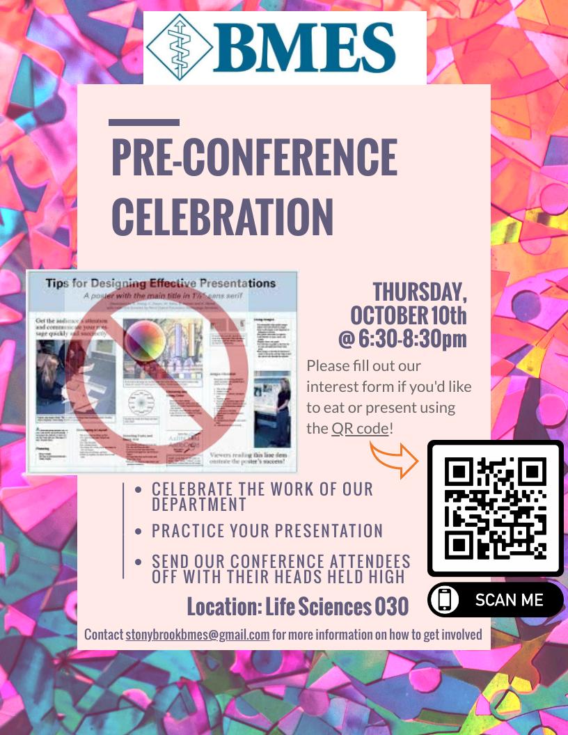 Join us for the BMES Pre-Conference Celebration on October 10th from 6:30pm to 8:30pm in Life Sciences 030