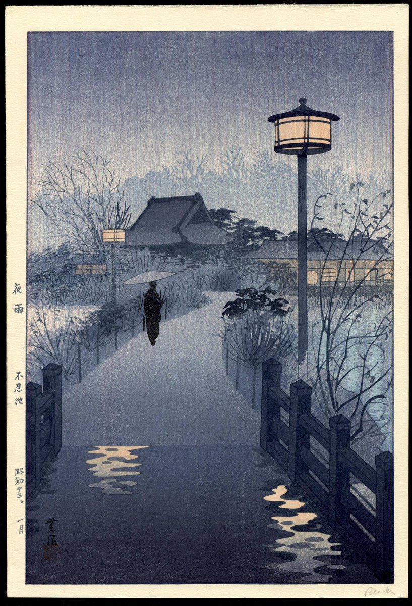 Evening rain on Shinobazu pond, by Shiro Kasamatsu, woodblock print, Japan 1938pic.twitter.com/vMn6P78vG9