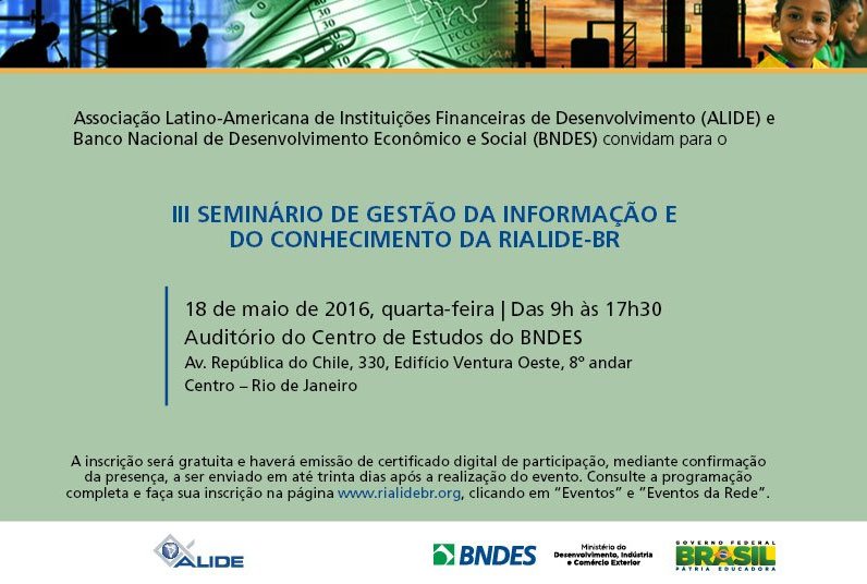 @_ALIDE_ e#BNDES, Seminário de Gestão da Informação e do Conhecimento http://bit.ly/24Y00Ry pic.twitter.com/OMuJAMhmHr