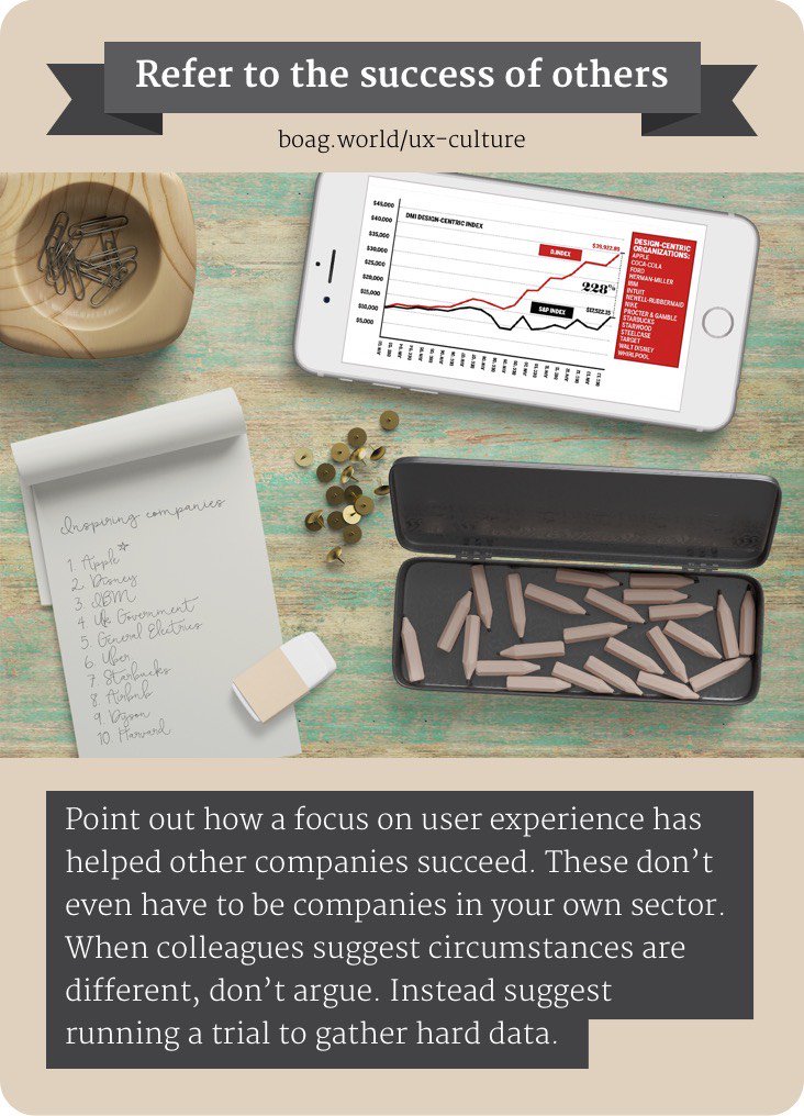 Drip feed management with the successes of companies who focus on improving UX. The message will eventually sink in. http://boag.me/2tsc6Ga pic.twitter.com/BHyOxR95ru
