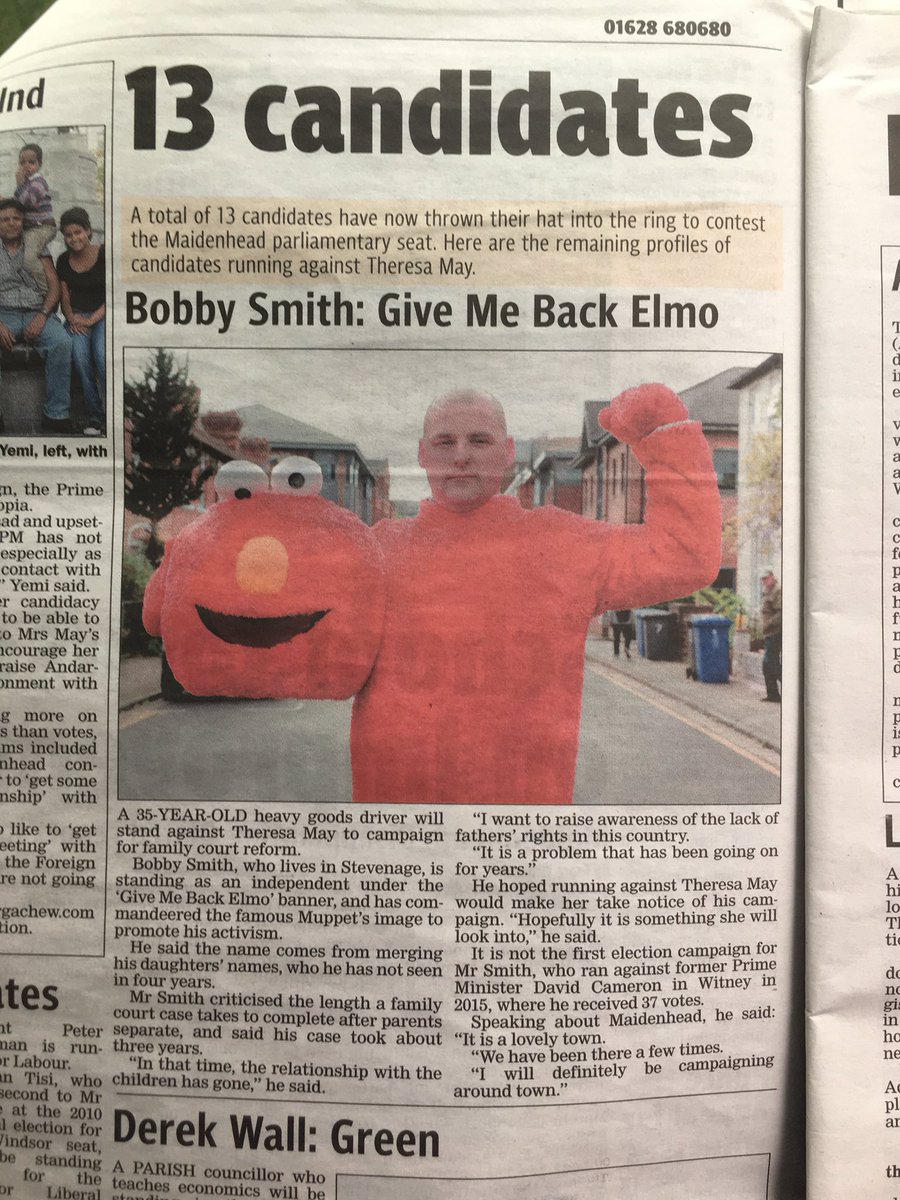 Elmo will stand against Theresa May in the Maidenhead constituency at the General Election for Fathers rights.