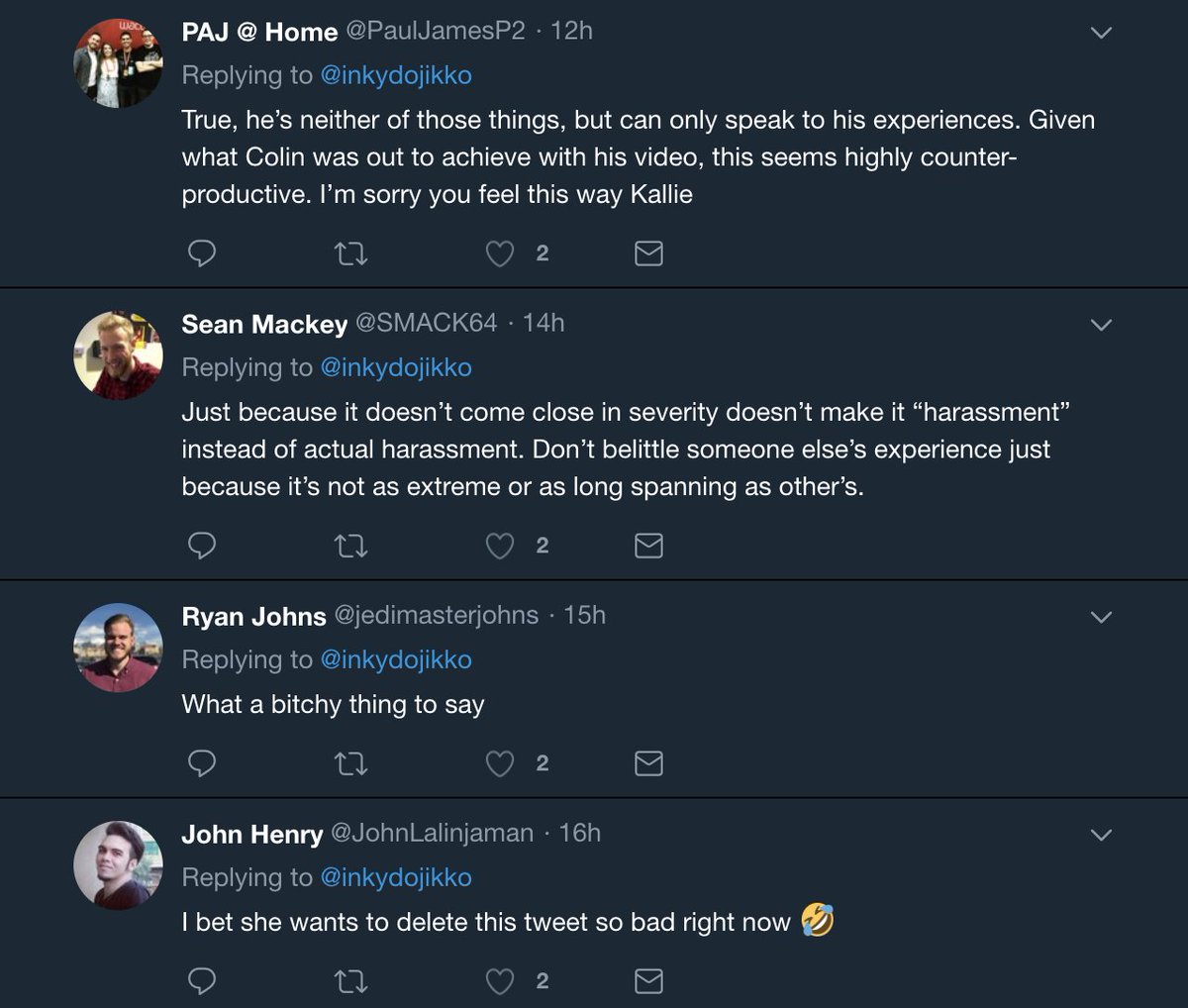 a woman in the games industry who actually went through sexual harassment is currently being dogpiled by Colin Moriarty fans because she subtweeted his recent dumb video. what a damn messpic.twitter.com/3SAPWIJs75