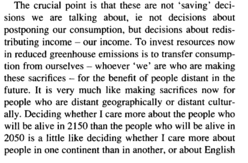 We should pay fair compensation for the damage our externalities will cause. In this context, the concepts of "investment" and "income transfer or redistribution" are completely irrelevant. We should compensate future generations because it is they who will be damaged.