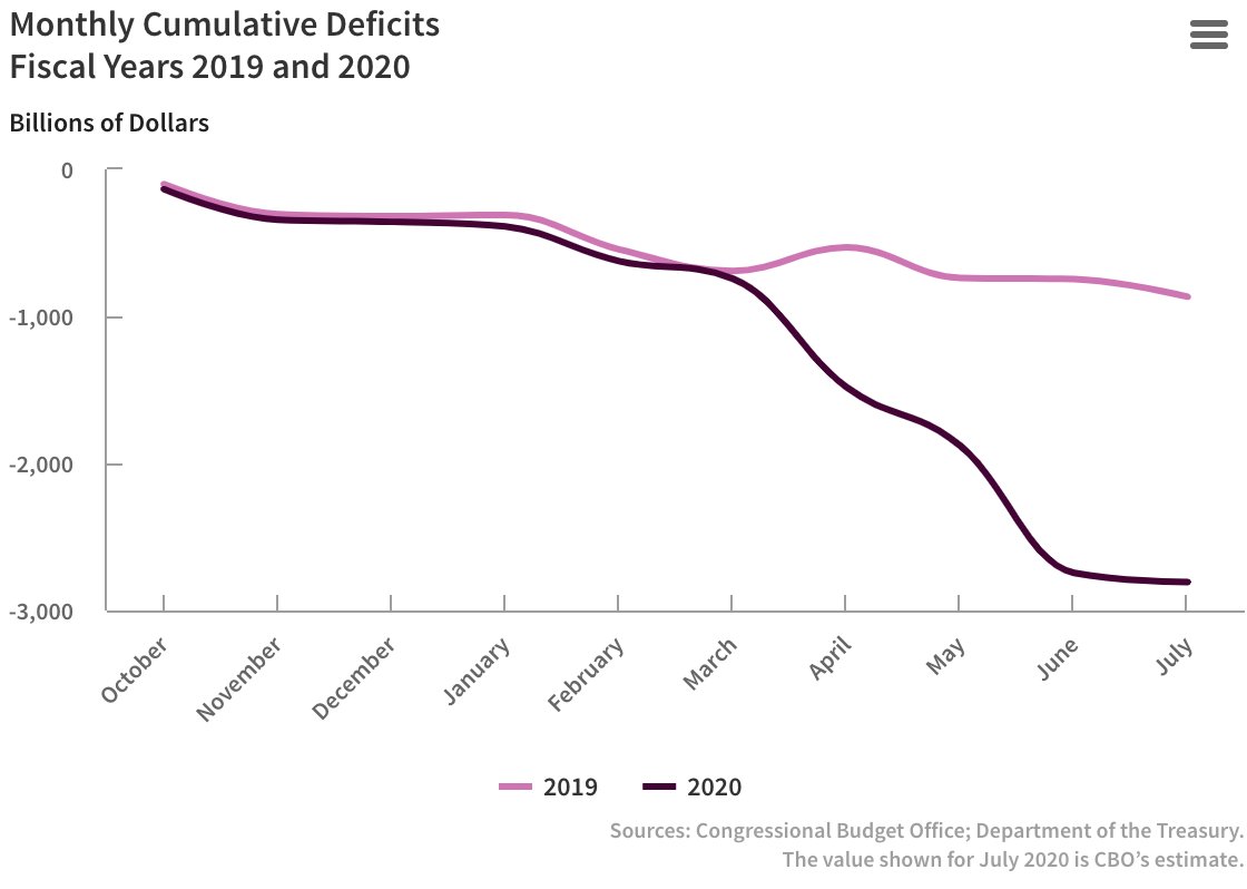CBO's Monthly Budget Review for July 2020 estimates that the federal budget deficit was $2.8 trillion in the first ten months of FY 2020, $1.9 trillion more than the deficit recorded during the same period last year. https://www.cbo.gov/publication/56497 …pic.twitter.com/xtBQxHWSy5