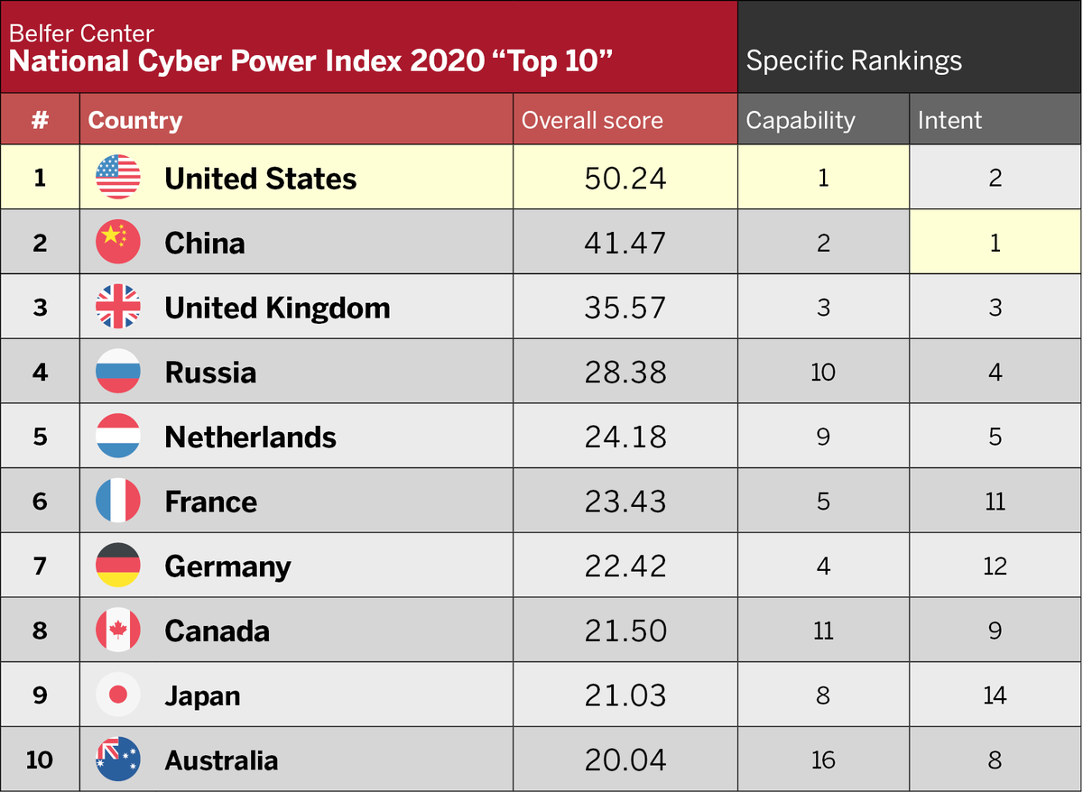 Harvard's Belfer Center has developed a National Cyber Power Index (NCPI) ranking 30 countries’ cyber capabilities based on 7 national objectives, 32 intent indicators, and 27 capability indicators. See: https://www.belfercenter.org/publication/national-cyber-power-index-2020 …pic.twitter.com/d7IIL3jmi0