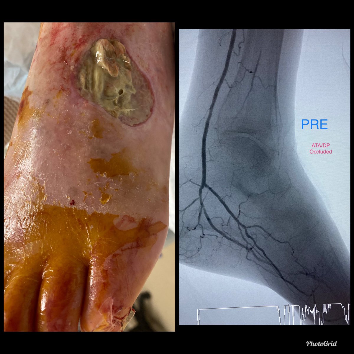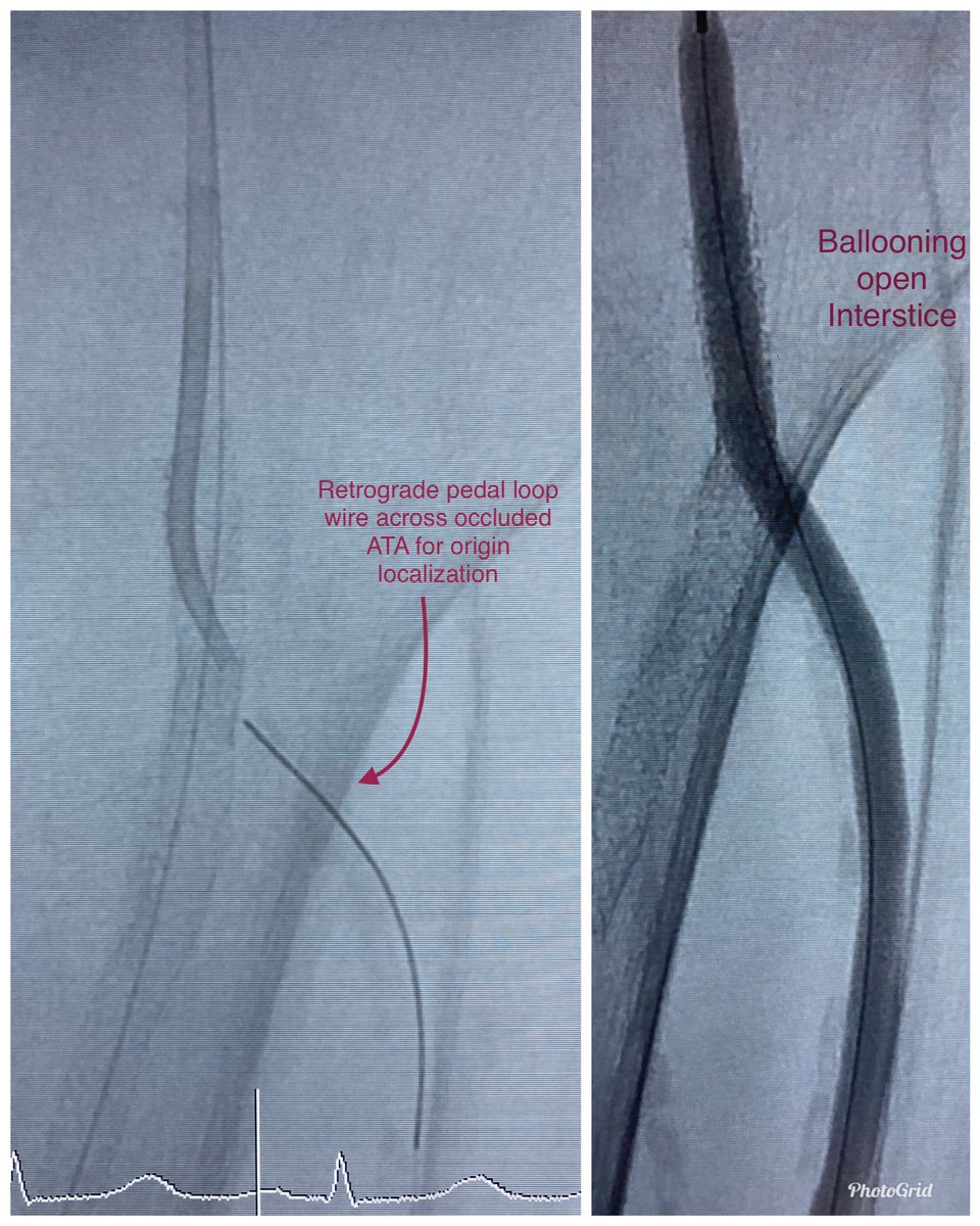 Dorsal foot wound, stent jailing origin of occluded AT, unable to retrograde puncture occluded AT. Pedal loop retrograde traversal of occluded AT to localize its origin followed by antegrade traversal of stent interstices, balloon, stent