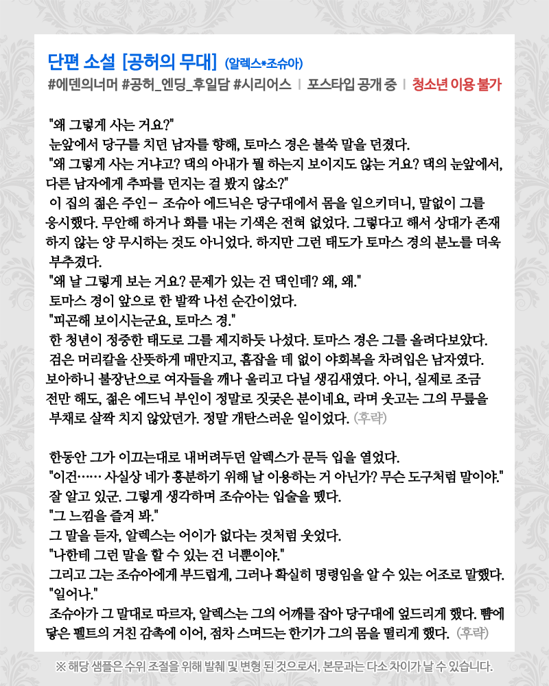 #에덴의너머 화이트데이 기념 소설 <공허의 무대>가 포스타입에 업로드 되었습니다! "공허" 엔딩 이후 이어지는 조슈아의 비틀어진 삶을 엿볼 수 있는 기회입니다. - 알렉스*조슈아 -#애증#시리어스#R19 (로그인+성인 인증 후 디지털 구매 가능)