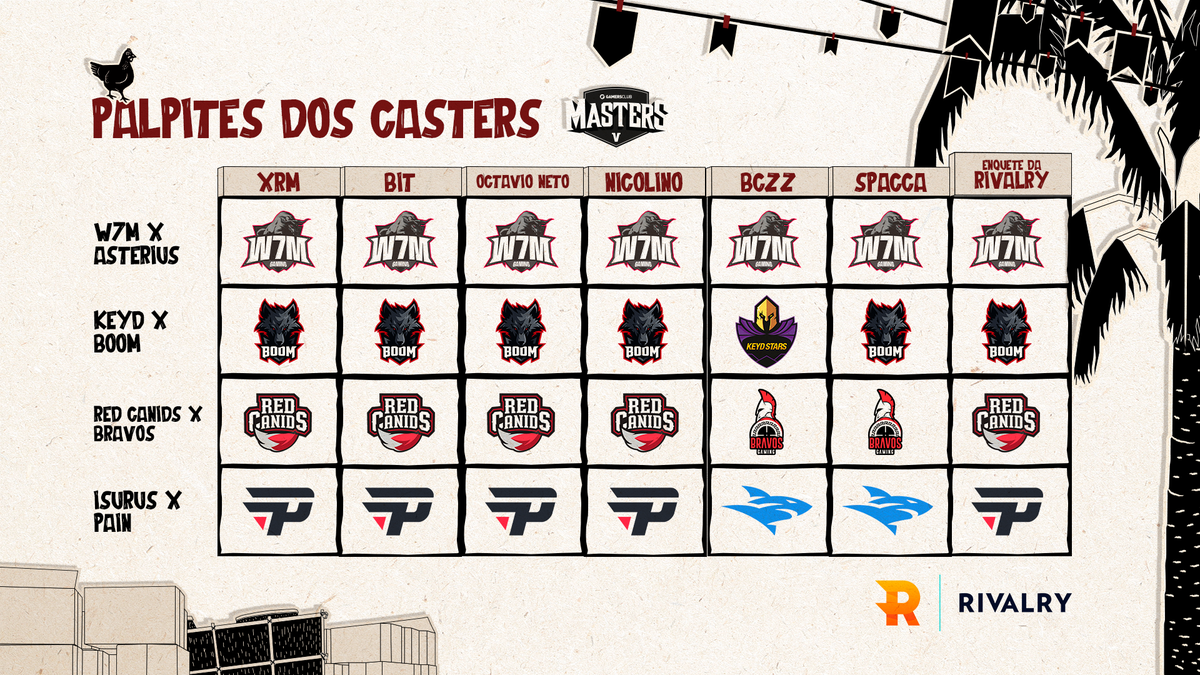 Minhas previsões para a #GCMasters junto do time de casters! A @boomesportsid é a aposta segura porém considerando MD1 e o campeonato ser na internet, fui de fé na @VivoKeyd que vem se preparando bastante pro campeonato. Vamos ver se esse resultado sai!https://twitter.com/GamersClubCS/status/1288854950722887680 …