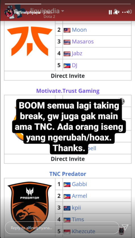 @LiquipediaDota BTS S4 page. It is confirmed that neither Khezcute nor other BOOM Esports player join the competition.