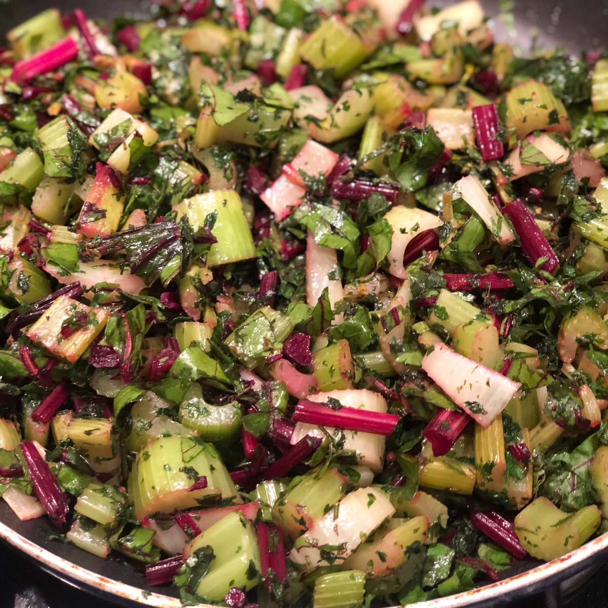 I started off sautéing the celery for khoresh karafs - celery stew and ended up adding a bunch of beet stems and greens to it as well. Keep in mind beet greens and stems are naturally salty so taste first and add salt judiciously.