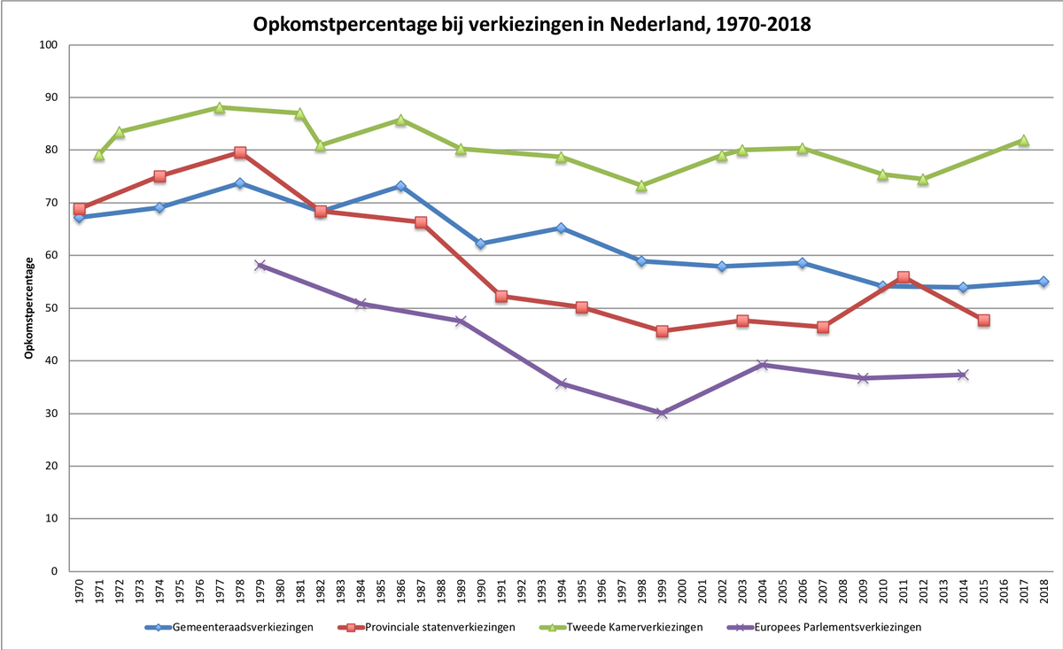Opkomstcijfers – Vanaf 1970 dalen de opkomstcijfers voor de verkiezingen geleidelijk. Dat geldt vooral voor de gemeentelijke en provinciale verkiezingen. Bij de laatste verkiezingen voor de Tweede Kamer was de opkomst 81,9 % #VerkiezingenInBeeldpic.twitter.com/nJ8G6kc5EX