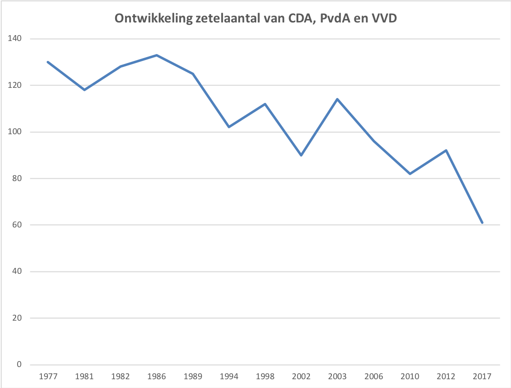 Bestuurderspartijen – Het electorale aandeel van de drie bestuurderspartijen CDA, PvdA en VVD is in de afgelopen decennia afgenomen. In 1970 hadden zij 130 van de 150 zetels, in 2017 is dat aantal afgenomen tot 61 #VerkiezingenInBeeldpic.twitter.com/OIWWAKbufI