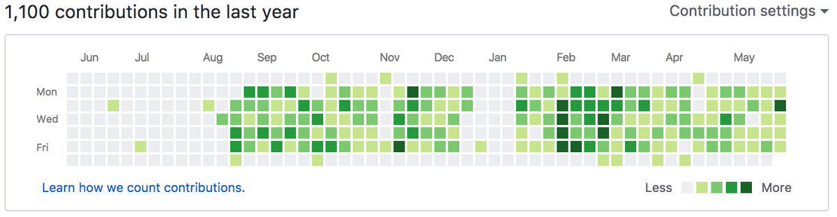 My Github contributions is becoming alarmingly consistent. It literally plots when I went on holidays (long gaps) or was sick (short gaps).pic.twitter.com/GXdtAW38du