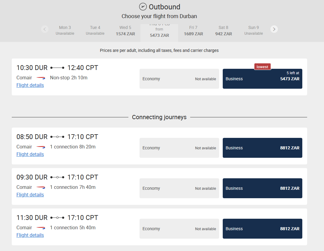 Is something happening in CPT tomorrow? 6k to get there seems excessive.pic.twitter.com/gvkTfRCnlj