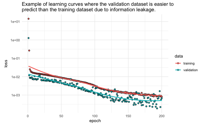 Learning curve issue #7: Underrepresented validation data Val loss < train loss, no matter how many iterations performed. Often from data leakage or poor sampling procedures. Try: 1. ✓ for dup obs 2. ✓ for data leaks 3.