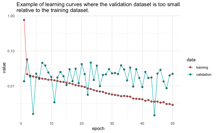 Learning curve issue #6: Underrepresented validation data Train loss looks to be learning but valid loss shows noisy movements and little or no improvement. Try: 1.