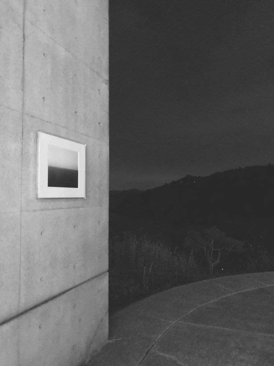 This looks like an imaginary scene. But it very closely resembles a real scene, at the Benesse House Museum in Naoshima, Japan. There, on a concrete wall, overlooking the sea, hang a number of prints from the Hiroshi Sugimoto series Seascapes.pic.twitter.com/SS6mXTi8FZ