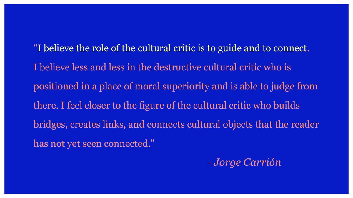Writer @jorgecarrion21 on understanding your creative process as something inherently mixed up in the business of living, the evolving role of the cultural critic, & why experimenting across forms is the future of media