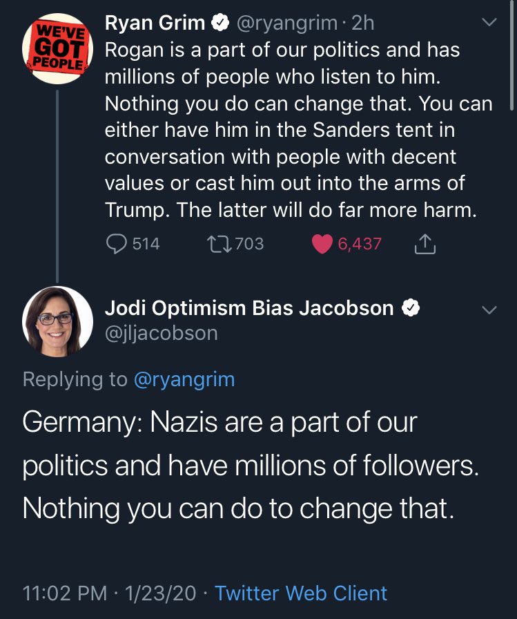 the checkmark going viral is a warren supporter concern trolling about rogan endorsing bernie inbetween her daily takes about bernie’s sexism & whatnot. she is not “literally crushed”. this is performative outrage comparing 7 million viewers of a talk show to nazis parody worldpic.twitter.com/0s8YXwRDJx