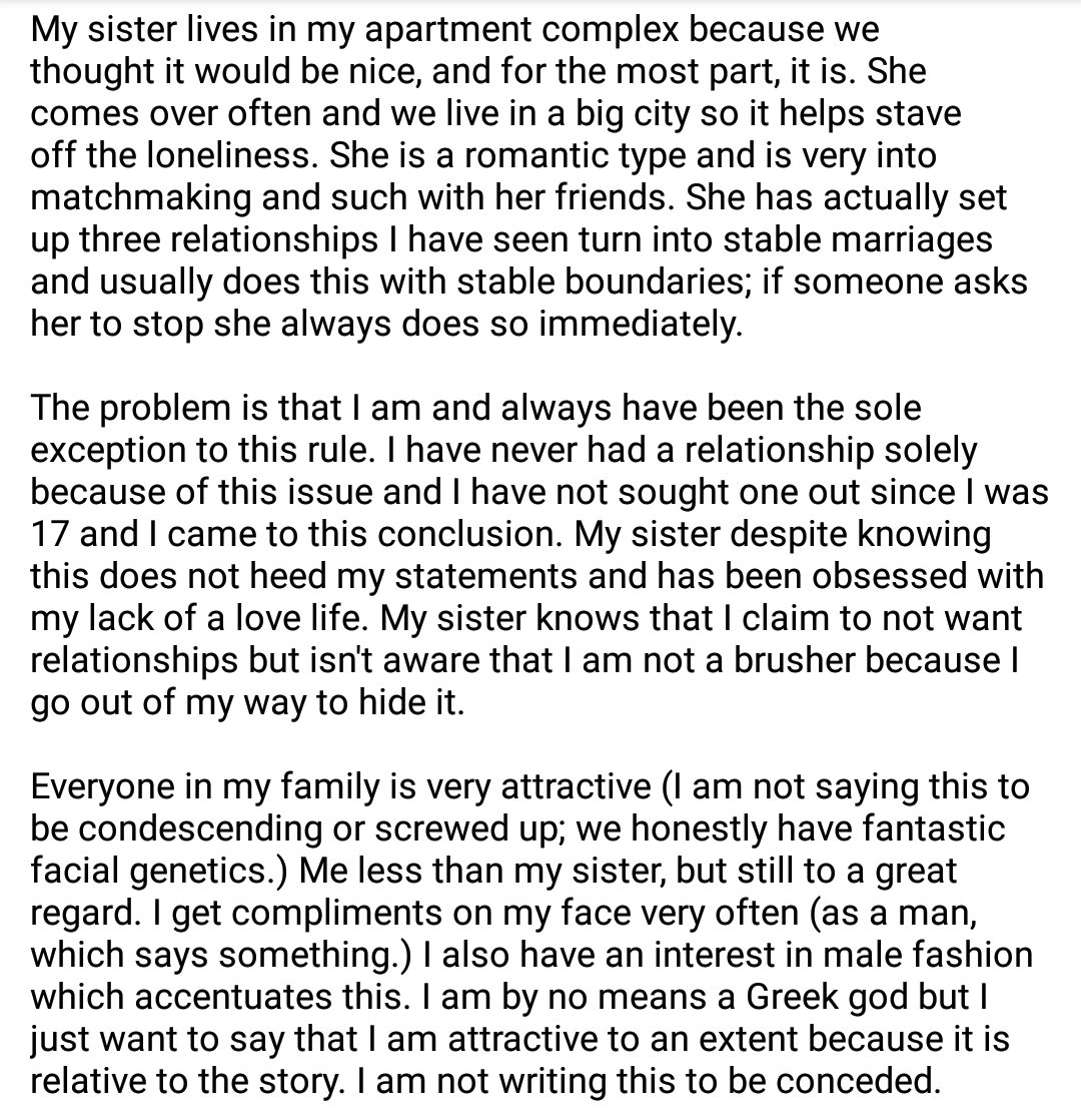 I [25 M] do not brush my teeth. My sister [23 F] keeps trying to push me into relationships that are doomed to fail because of this.pic.twitter.com/3RuUtZGcN9