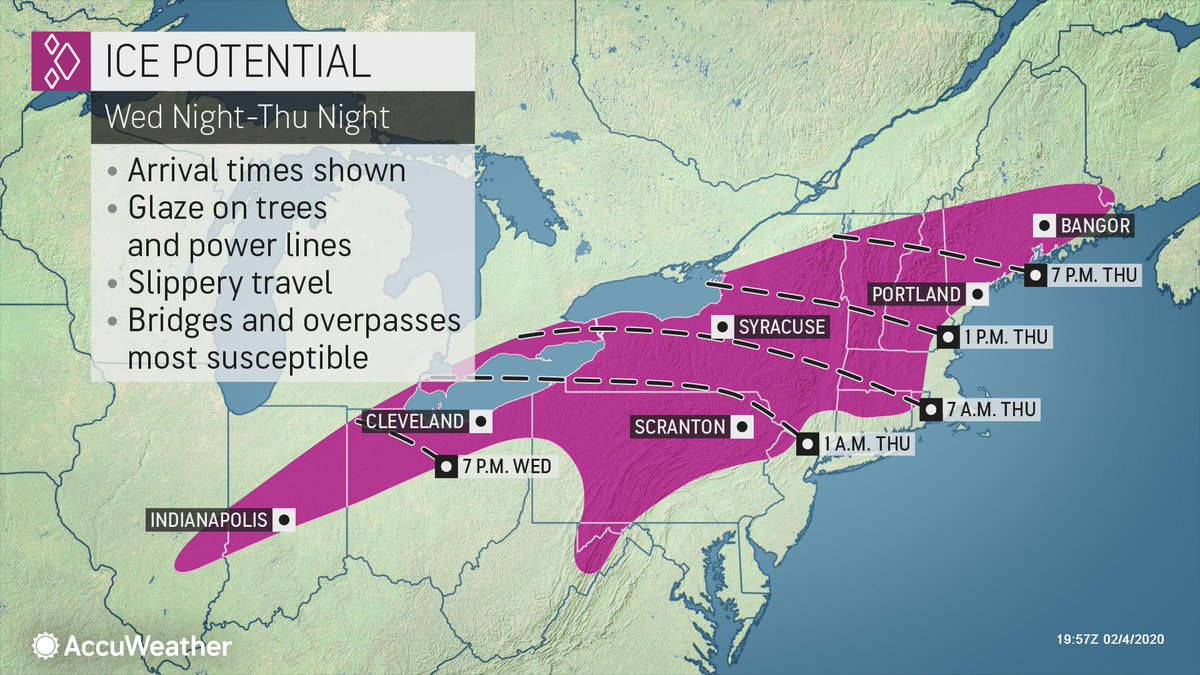 Ice & freezing rain may cause travel disruptions from Wednesday night through Thursday as a winter storm hits the Midwest & Northeast. Indianapolis; Cleveland, Syracuse and Albany, NY, & Portland, ME are a few cities that may face icy conditions: https://bit.ly/2ShBewD pic.twitter.com/H2zJ6Q3axG