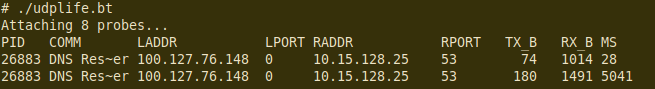 new BPF tool: http://udplife.bt , showing UDP session lifespans. A solution for Chapter 10 exercise 6 https://github.com/brendangregg/bpf-perf-tools-book/blob/master/exercises/Ch10_Networking/udplife.bt …pic.twitter.com/KVNQ94cV8W