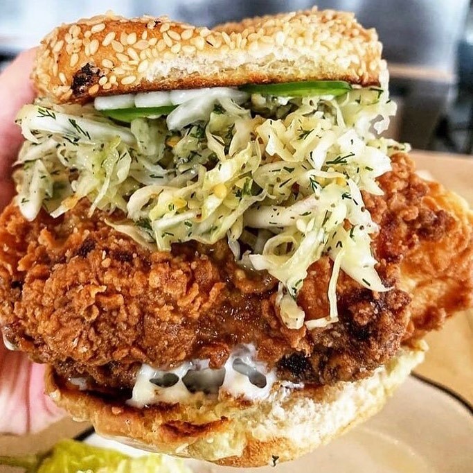 The sandwich of the week consists of a whole fried chicken breast, cabbage coleslaw, jalapeños, mayonnaise, and a toasted sesame seed bun