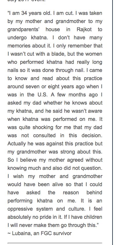 Another common theme reflected in this testimonial: in FGC cultures, the fathers/men are obliviious, excluded, often opposed, while the women (esp grndmothers) are the drivers, carying on the tradition