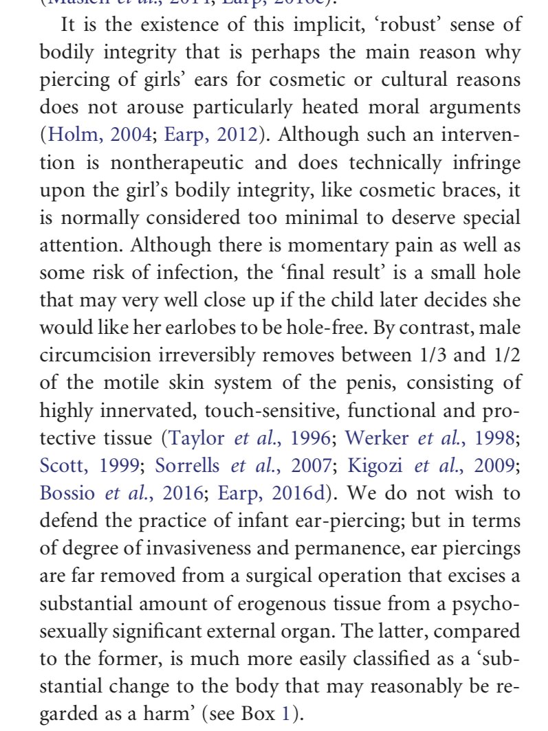 Ear piercing does not remove erogenous tissue from a child's most intimate body part; the analogy is invalid. https://www.researchgate.net/publication/320853591_Circumcision_autonomy_and_public_health … No documented harm? Here's a partial list: http://www.cirp.org/library/complications/ … Health benefits? Don't outweigh risks https://www.tandfonline.com/doi/full/10.1080/17441692.2016.1184292 …pic.twitter.com/rm5vaCkYXj