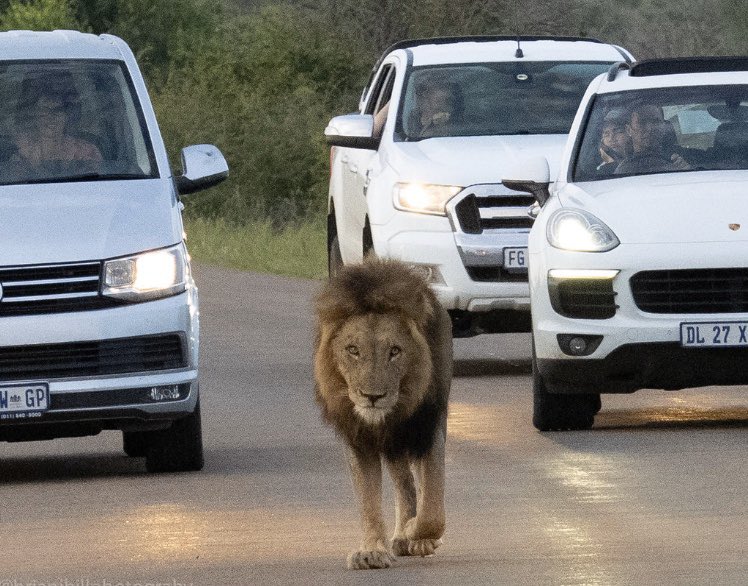 Just before sunrise this lion was happy to stroll down the main road subsequently causing a traffic jam. No need to zoom in photo 2, I moved slightly & he noticed
