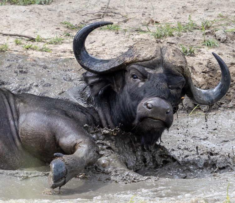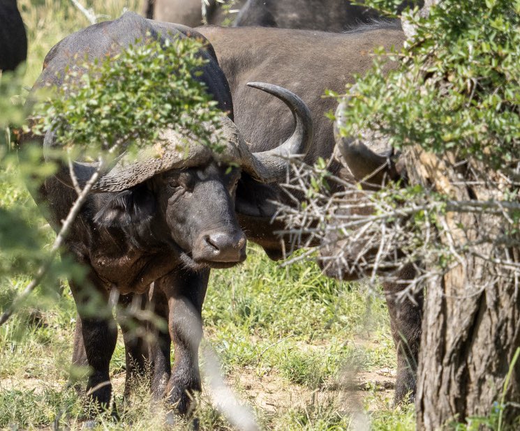 A curious African buffalo peers out at us from behind a bush, while others in photos 2,3 &4 enjoy a moment in the water