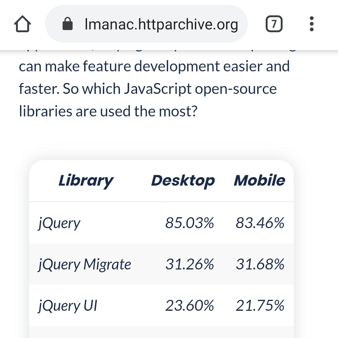 @HTTPArchive ... Still around 85%! Lots is legacy reliance, sure, but I still see it on new sites too! https://almanac.httparchive.org/en/2019/javascript …pic.twitter.com/vMgjzuoTTl