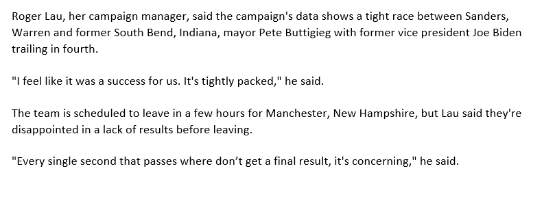 Sanders, Buttigieg and Warren are viable here, though we don’t get the first alignment numbers right away. It appears Bernie and Warren folks are making overtures to the Yang contingency. These person-to-person conversations and persuasion make the caucuses so unique.