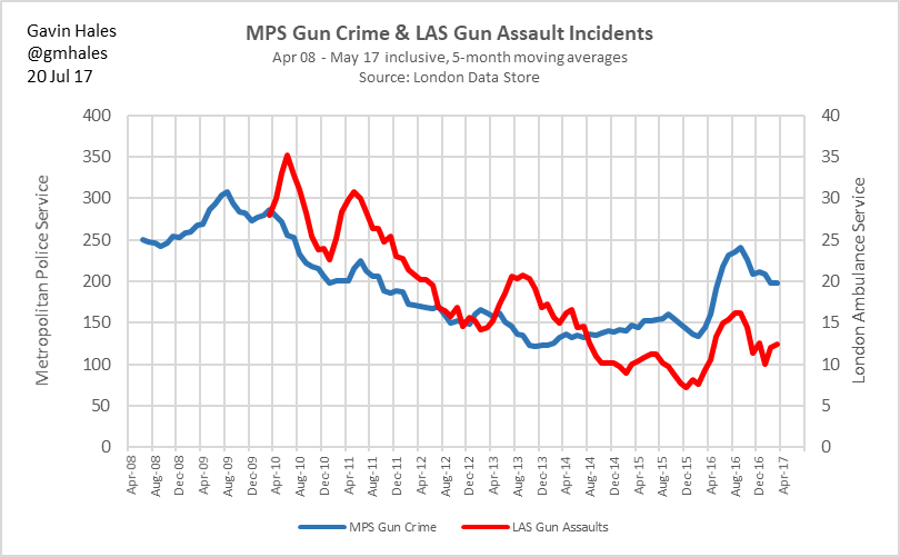 #guncrime spike in 2016 clearly visible in both MPS data and @Ldn_Ambulance gun injuries data; injuries still low in context of time seriespic.twitter.com/saEblOG8dU