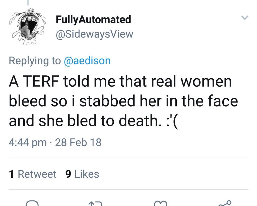 We have archives of death threats, threats of sexual violence, fantasies of killing feminists and our children and using our body parts. http://Terfisaslur.com is a start. Here is some of the milder stuff.pic.twitter.com/ZpbCvZ7g7k