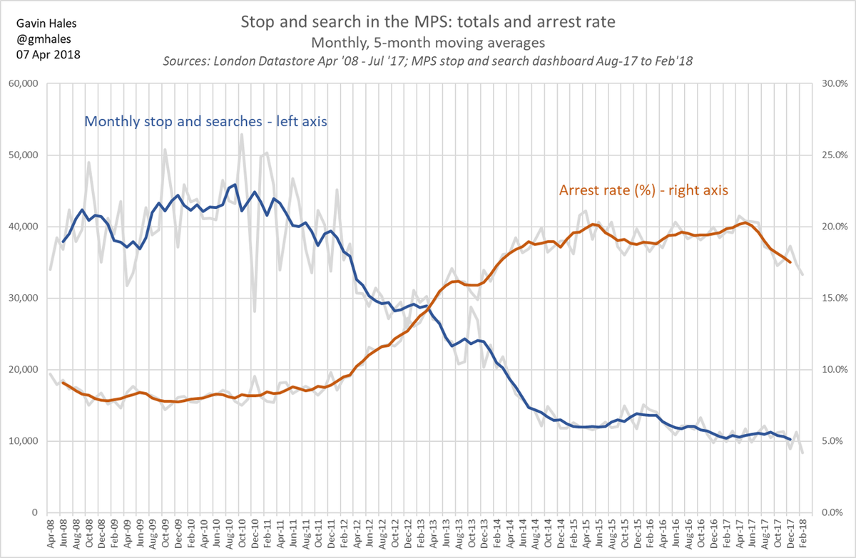 Quick look at #stopsearch in the MPS, latest data to Feb 2018. Arrest rate has been falling since last summer - was only 16.6% in Feb 2018, despite lower volumes. Becoming less targeted?pic.twitter.com/2Du0I1xf9H