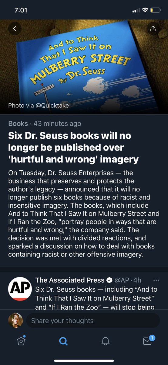 The world changes *fast.* yesterday Dr Seuss was fine. Today, I click on Dr Seuss trending and am hit with this cautionary message