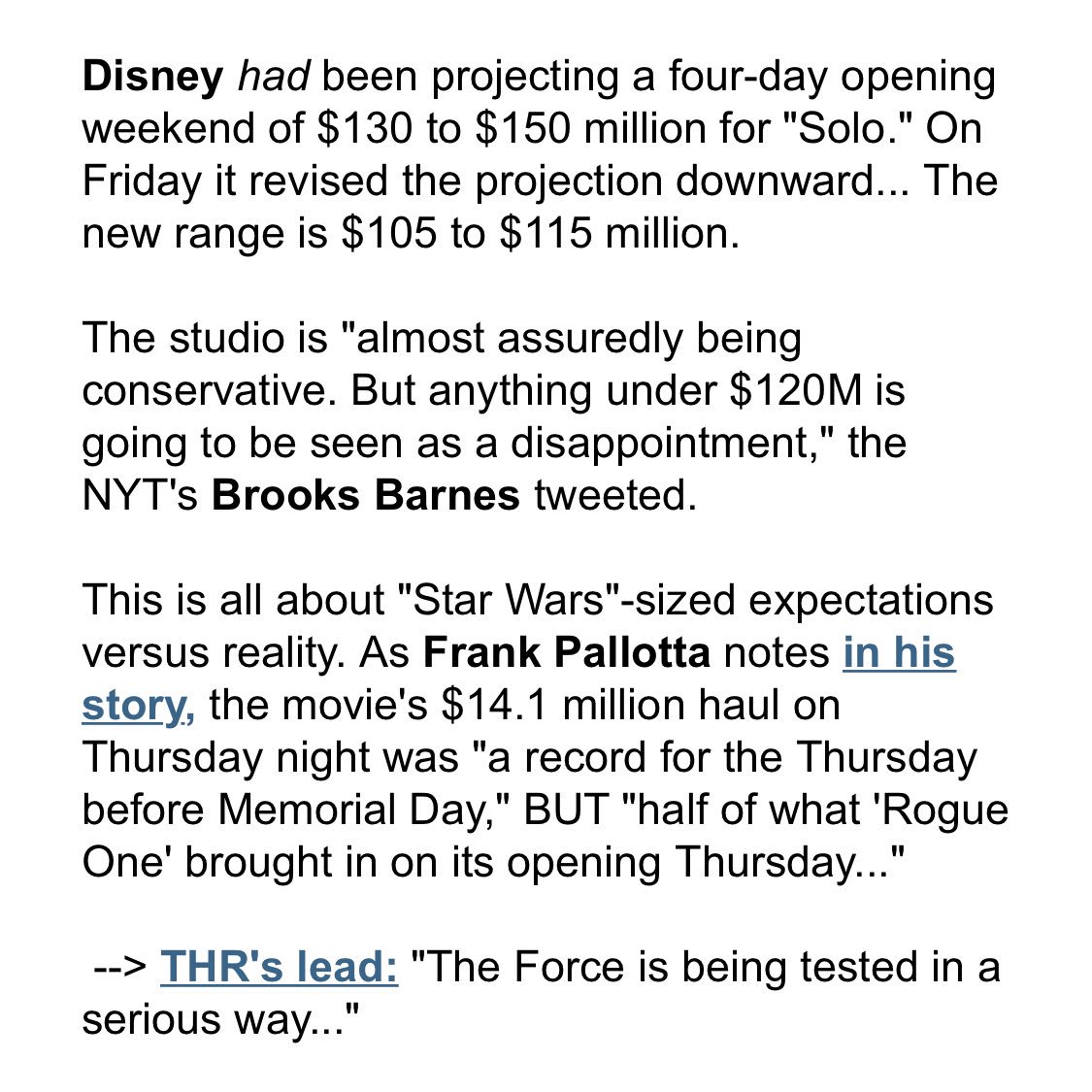Really does seem like Solo is gonna be the first movie that just does "really well by normal standards" versus "really well by Star Wars standards," where "Star Wars standards" = "levels most movies could only dream of"