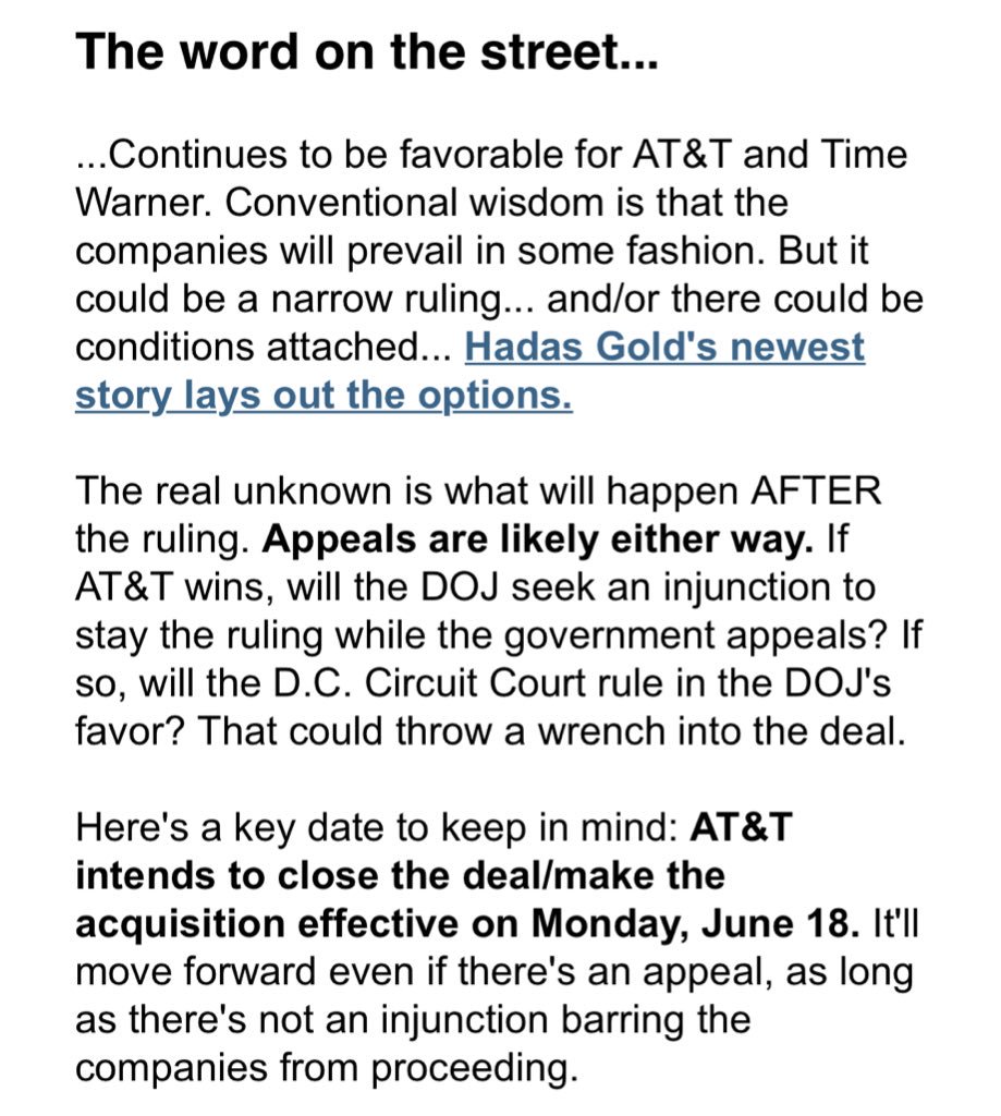 Word on the street favors AT&T. But there are multiple ways the Time Warner deal could still fall apart. Here's my explainer while we await the rulingpic.twitter.com/bVOeyjq5ac