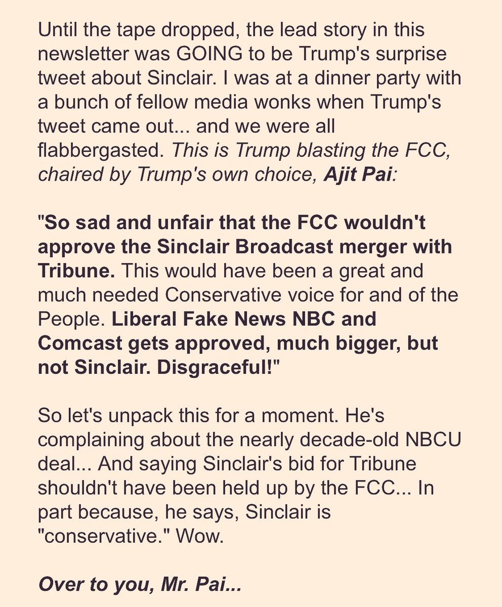But why did Ajit turn down Sinclair? The deal was about to go through and would have made Republicans propaganda tv reach 75% households. I thought Fox nixed it - but then why is Trump saying he’s mad? Unless..........he’s lying.