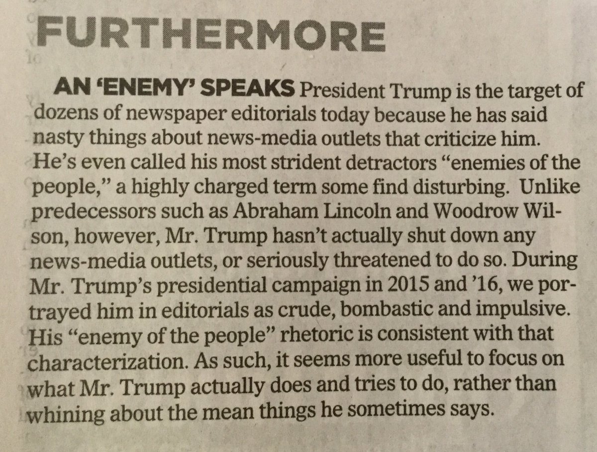These simultaneous editorials in independent newspapers, published at the same time, will surely put to rest Trump's argument that the journalistic class is coordinating their attacks against him. Well done.