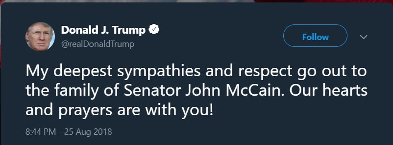 Reactions of our nation's leaders to death of Sen. John S. McCain III, retired Navy captain, tortured Vietnam War POW, Silver Star recipient, son of a WWII admiral and grandson of a WWI admiral:pic.twitter.com/lhsAVrxmJo