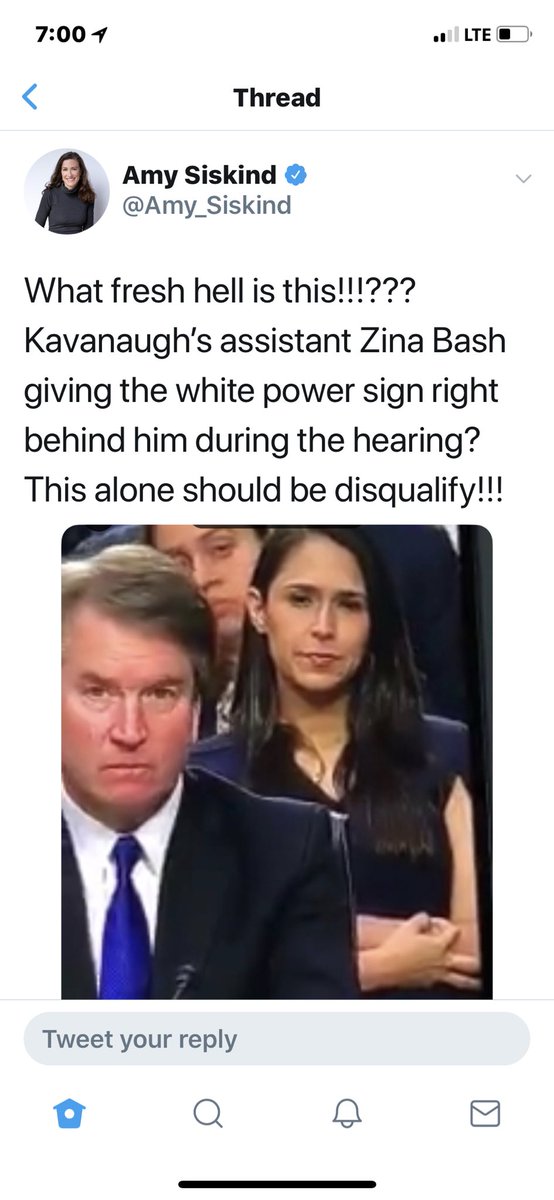 Are you guys going to apologize for being wrong? Zina Bash flashed the white Power sign again today. She’s the racist we all said she was:https://twitter.com/ACNewman/status/1037895996292849664 …