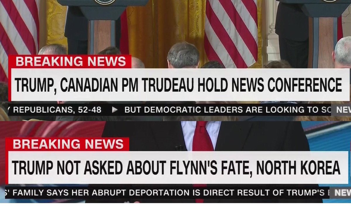 Third banner should say "Trump calls only on media allies for questions. None challenged him."